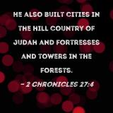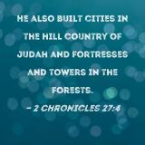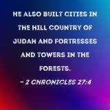 He also built cities in the hill country of Judah and fortresses and towers in the forests.