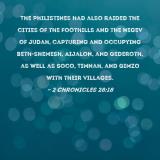 The Philistines had also raided the cities of the foothills and the Negev of Judah, capturing and occupying Beth-shemesh, Aijalon, and Gederoth, as well as Soco, Timnah, and Gimzo with their villages.
