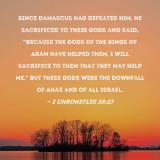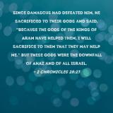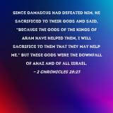 Pictures and Artwork Since Damascus had defeated him, he sacrificed to their gods and said, "Because the gods of the kings of Aram have helped them, I will sacrifice to them that they may help me." But these gods were the downfall of Ahaz and of all Israel. |