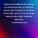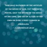 Then Ahaz gathered up the articles of the house of God, cut them into pieces, shut the doors of the house of the LORD, and set up altars of his own on every street corner in Jerusalem.