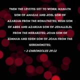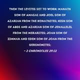 Then the Levites set to work: Mahath son of Amasai and Joel son of Azariah from the Kohathites; Kish son of Abdi and Azariah son of Jehallelel from the Merarites; Joah son of Zimmah and Eden son of Joah from the Gershonites;