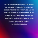 Pictures and Artwork So the priests went inside the house of the LORD to cleanse it, and they brought out to the courtyard all the unclean things that they found in the temple of the LORD. Then the Levites took these things and carried them out to the Kidron Valley. |