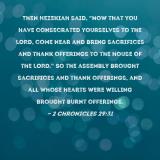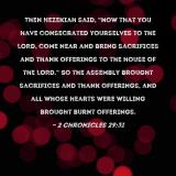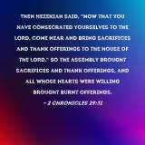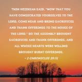 Pictures and Artwork Then Hezekiah said, "Now that you have consecrated yourselves to the LORD, come near and bring sacrifices and thank offerings to the house of the LORD." So the assembly brought sacrifices and thank offerings, and all whose hearts were willing brought burnt offerings. |