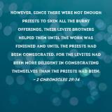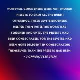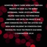 Pictures and Artwork However, since there were not enough priests to skin all the burnt offerings, their Levite brothers helped them until the work was finished and until the priests had been consecrated. For the Levites had been more diligent in consecrating themselves than the priests had been. |