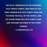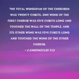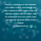 The total wingspan of the cherubim was twenty cubits. One wing of the first cherub was five cubits long and touched the wall of the temple, and its other wing was five cubits long and touched the wing of the other cherub.