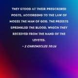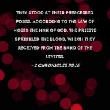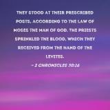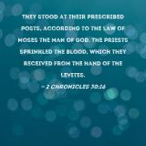 They stood at their prescribed posts, according to the Law of Moses the man of God. The priests sprinkled the blood, which they received from the hand of the Levites.