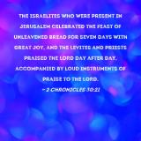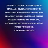 Pictures and Artwork The Israelites who were present in Jerusalem celebrated the Feast of Unleavened Bread for seven days with great joy, and the Levites and priests praised the LORD day after day, accompanied by loud instruments of praise to the LORD. |