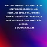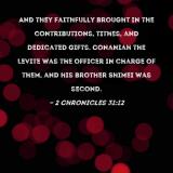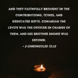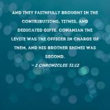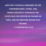 And they faithfully brought in the contributions, tithes, and dedicated gifts. Conaniah the Levite was the officer in charge of them, and his brother Shimei was second.