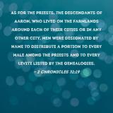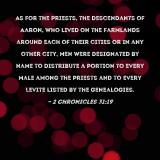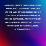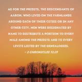 Pictures and Artwork As for the priests, the descendants of Aaron, who lived on the farmlands around each of their cities or in any other city, men were designated by name to distribute a portion to every male among the priests and to every Levite listed by the genealogies. |