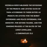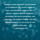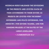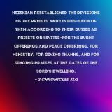 Pictures and Artwork Hezekiah reestablished the divisions of the priests and Levites--each of them according to their duties as priests or Levites--for the burnt offerings and peace offerings, for ministry, for giving thanks, and for singing praises at the gates of the LORD's dwelling. |