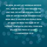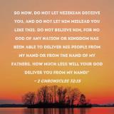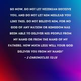 Pictures and Artwork So now, do not let Hezekiah deceive you, and do not let him mislead you like this. Do not believe him, for no god of any nation or kingdom has been able to deliver his people from my hand or from the hand of my fathers. How much less will your God deliver you from my hand!" |
