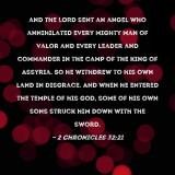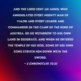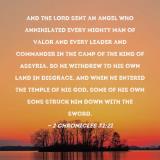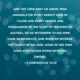 Pictures and Artwork and the LORD sent an angel who annihilated every mighty man of valor and every leader and commander in the camp of the king of Assyria. So he withdrew to his own land in disgrace. And when he entered the temple of his god, some of his own sons struck him down with the sword. |
