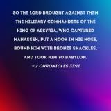 So the LORD brought against them the military commanders of the king of Assyria, who captured Manasseh, put a hook in his nose, bound him with bronze shackles, and took him to Babylon.
