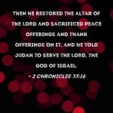 Then he restored the altar of the LORD and sacrificed peace offerings and thank offerings on it, and he told Judah to serve the LORD, the God of Israel.