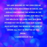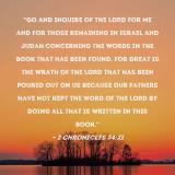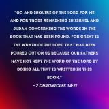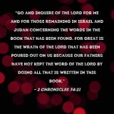 Pictures and Artwork "Go and inquire of the LORD for me and for those remaining in Israel and Judah concerning the words in the book that has been found. For great is the wrath of the LORD that has been poured out on us because our fathers have not kept the word of the LORD by doing all that is written in this book." |