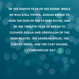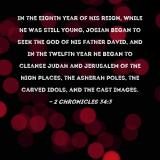 Pictures and Artwork In the eighth year of his reign, while he was still young, Josiah began to seek the God of his father David, and in the twelfth year he began to cleanse Judah and Jerusalem of the high places, the Asherah poles, the carved idols, and the cast images. |
