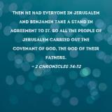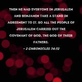 Then he had everyone in Jerusalem and Benjamin take a stand in agreement to it. So all the people of Jerusalem carried out the covenant of God, the God of their fathers.