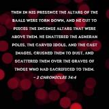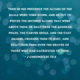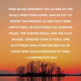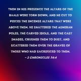 Pictures and Artwork Then in his presence the altars of the Baals were torn down, and he cut to pieces the incense altars that were above them. He shattered the Asherah poles, the carved idols, and the cast images, crushed them to dust, and scattered them over the graves of those who had sacrificed to them. |