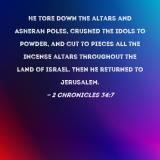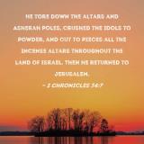 He tore down the altars and Asherah poles, crushed the idols to powder, and cut to pieces all the incense altars throughout the land of Israel. Then he returned to Jerusalem.