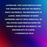 Pictures and Artwork Afterward, they made preparations for themselves and for the priests, since the priests, the descendants of Aaron, were offering up burnt offerings and fat until nightfall. So the Levites made preparations for themselves and for the priests, the descendants of Aaron. |