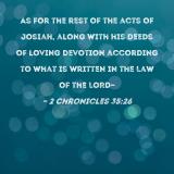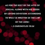 As for the rest of the acts of Josiah, along with his deeds of loving devotion according to what is written in the Law of the LORD--