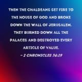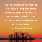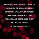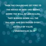Then the Chaldeans set fire to the house of God and broke down the wall of Jerusalem. They burned down all the palaces and destroyed every article of value.