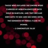 Those who escaped the sword were carried by Nebuchadnezzar into exile in Babylon, and they became servants to him and his sons until the kingdom of Persia came to power.