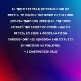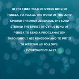 In the first year of Cyrus king of Persia, to fulfill the word of the LORD spoken through Jeremiah, the LORD stirred the spirit of Cyrus king of Persia to send a proclamation throughout his kingdom and to put it in writing as follows: