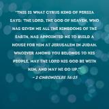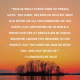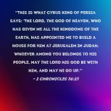 Pictures and Artwork "This is what Cyrus king of Persia says: 'The LORD, the God of heaven, who has given me all the kingdoms of the earth, has appointed me to build a house for Him at Jerusalem in Judah. Whoever among you belongs to His people, may the LORD his God be with him, and may he go up.'" |