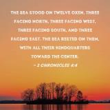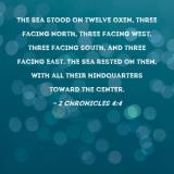 The Sea stood on twelve oxen, three facing north, three facing west, three facing south, and three facing east. The Sea rested on them, with all their hindquarters toward the center.