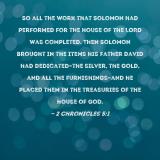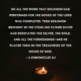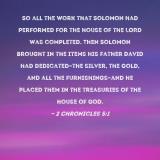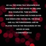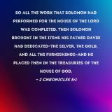 Pictures and Artwork So all the work that Solomon had performed for the house of the LORD was completed. Then Solomon brought in the items his father David had dedicated--the silver, the gold, and all the furnishings--and he placed them in the treasuries of the house of God. |
