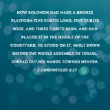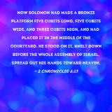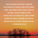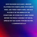Pictures and Artwork Now Solomon had made a bronze platform five cubits long, five cubits wide, and three cubits high, and had placed it in the middle of the courtyard. He stood on it, knelt down before the whole assembly of Israel, spread out his hands toward heaven, |
