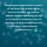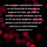 Pictures and Artwork Then Solomon consecrated the middle of the courtyard in front of the house of the LORD, and there he offered the burnt offerings and the fat of the peace offerings, since the bronze altar he had made could not contain all these offerings. |