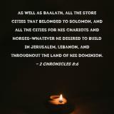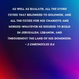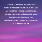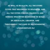as well as Baalath, all the store cities that belonged to Solomon, and all the cities for his chariots and horses--whatever he desired to build in Jerusalem, Lebanon, and throughout the land of his dominion.