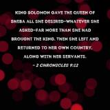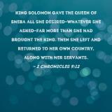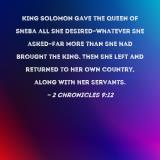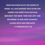 King Solomon gave the queen of Sheba all she desired--whatever she asked--far more than she had brought the king. Then she left and returned to her own country, along with her servants.
