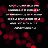 King Solomon made two hundred large shields of hammered gold; six hundred shekels of hammered gold went into each shield.