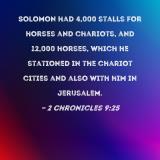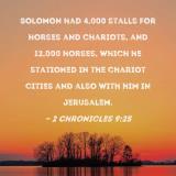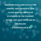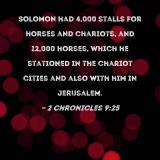 Solomon had 4,000 stalls for horses and chariots, and 12,000 horses, which he stationed in the chariot cities and also with him in Jerusalem.