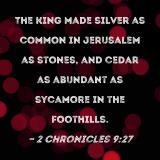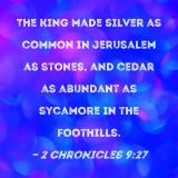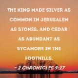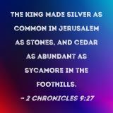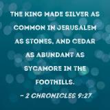 The king made silver as common in Jerusalem as stones, and cedar as abundant as sycamore in the foothills.