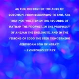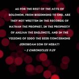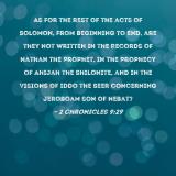 Pictures and Artwork As for the rest of the acts of Solomon, from beginning to end, are they not written in the Records of Nathan the Prophet, in the Prophecy of Ahijah the Shilonite, and in the Visions of Iddo the Seer concerning Jeroboam son of Nebat? |