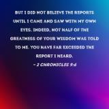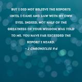 But I did not believe the reports until I came and saw with my own eyes. Indeed, not half of the greatness of your wisdom was told to me. You have far exceeded the report I heard.