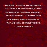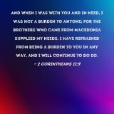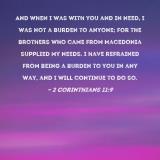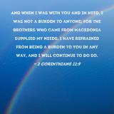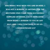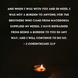 And when I was with you and in need, I was not a burden to anyone; for the brothers who came from Macedonia supplied my needs. I have refrained from being a burden to you in any way, and I will continue to do so.