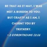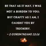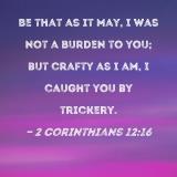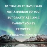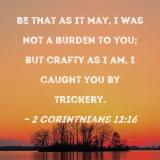 Be that as it may, I was not a burden to you; but crafty as I am, I caught you by trickery.