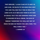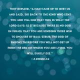 Pictures and Artwork They replied, "A man came up to meet us and said, 'Go back to the king who sent you and tell him that this is what the LORD says: Is it because there is no God in Israel that you are sending these men to inquire of Baal-zebub, the god of Ekron? Therefore you will not get up from the bed on which you are lying. You will surely die.'" |