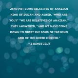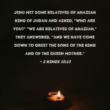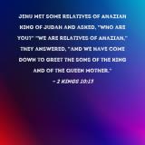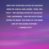 Jehu met some relatives of Ahaziah king of Judah and asked, "Who are you?" "We are relatives of Ahaziah," they answered, "and we have come down to greet the sons of the king and of the queen mother."