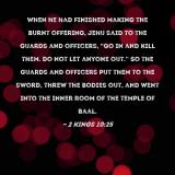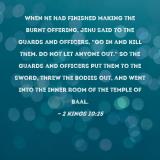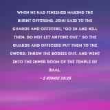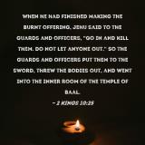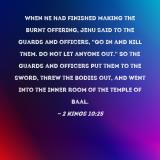 Pictures and Artwork When he had finished making the burnt offering, Jehu said to the guards and officers, "Go in and kill them. Do not let anyone out." So the guards and officers put them to the sword, threw the bodies out, and went into the inner room of the temple of Baal. |