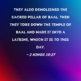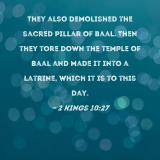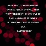 They also demolished the sacred pillar of Baal. Then they tore down the temple of Baal and made it into a latrine, which it is to this day.