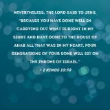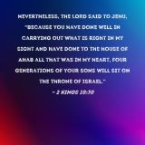 Pictures and Artwork Nevertheless, the LORD said to Jehu, "Because you have done well in carrying out what is right in My sight and have done to the house of Ahab all that was in My heart, four generations of your sons will sit on the throne of Israel." |