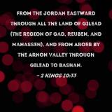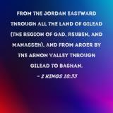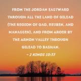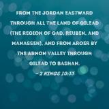 from the Jordan eastward through all the land of Gilead (the region of Gad, Reuben, and Manasseh), and from Aroer by the Arnon Valley through Gilead to Bashan.