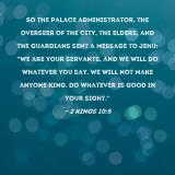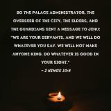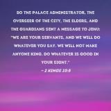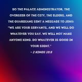 Pictures and Artwork So the palace administrator, the overseer of the city, the elders, and the guardians sent a message to Jehu: "We are your servants, and we will do whatever you say. We will not make anyone king. Do whatever is good in your sight." |