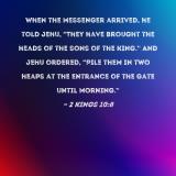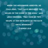 When the messenger arrived, he told Jehu, "They have brought the heads of the sons of the king." And Jehu ordered, "Pile them in two heaps at the entrance of the gate until morning."
